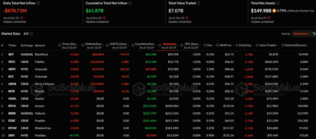 - Bitcoin ETFs saw $470 million in outflows as BTC prices falled below $110K.