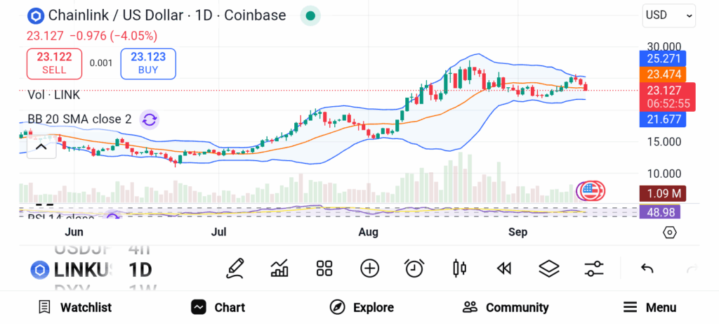 A recent highlight came when the United States Department of Commerce partnered with Chainlink to place macroeconomic data on blockchain networks. LINK trades near $23.62, less than half of a previous peak, leaving room for potential upside. Robust partnerships and expanding utility may draw traders as market volatility grows.