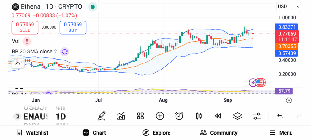 Ethena’s ENA surged over 30% this week after its stablecoin, USDe, became the third largest dollar-backed stablecoin globally. ENA broke key resistance levels in daily trading, attracting strong investor interest. Analysts suggest that moving past $0.85 could allow ENA to reach $1 or higher if momentum continues. Confidence in the token is growing due to the increasing adoption of USDe and the overall activity within the Ethena ecosystem. Traders are monitoring trading volume and momentum indicators to catch the next breakout. Continued interest in stablecoins could also provide indirect support for ENA’s price action.