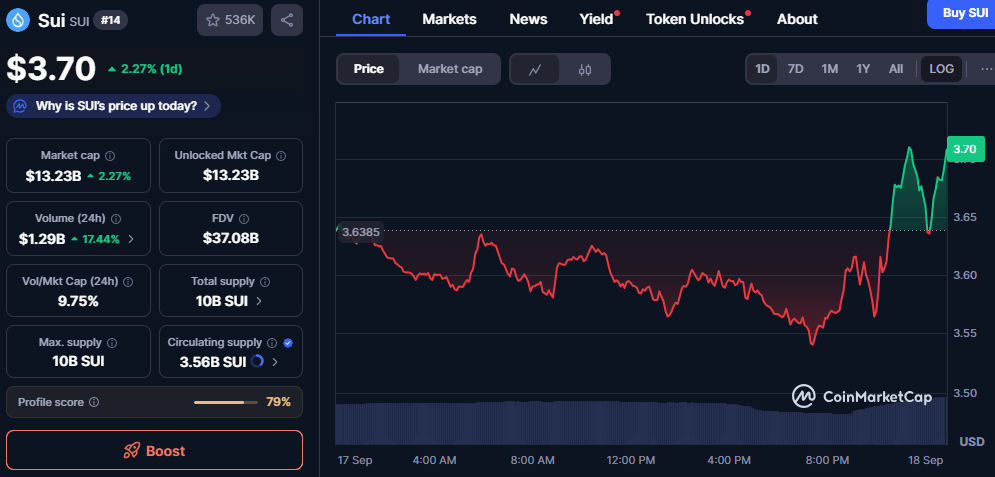 Sui traded at $3.70, marking a 2.27% daily increase and reinforcing bullish sentiment. Its market capitalization rose to $13.23 billion, driven by a $1.29 billion trading volume that climbed 17.44%. This growth confirmed increasing participation across both retail and institutional traders.