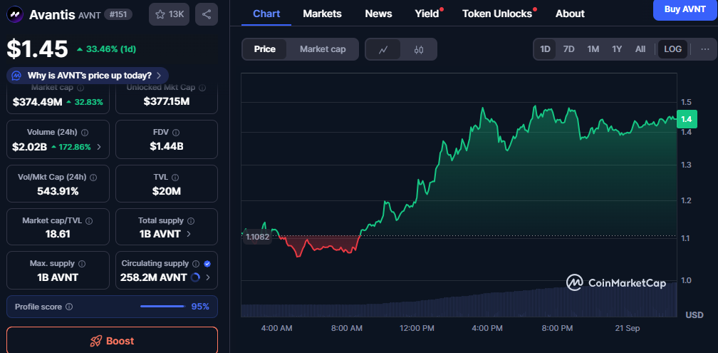 The token’s fully diluted valuation is $1.44 billion, with 258.2 million AVNT circulating from a total of one billion tokens. Its extraordinary volume-to-market cap ratio, above 500 percent, reflected intense speculative trading and rapid capital movement. Additionally, the project recorded a total value locked of $20 million, underscoring its DeFi relevance.