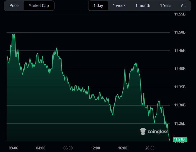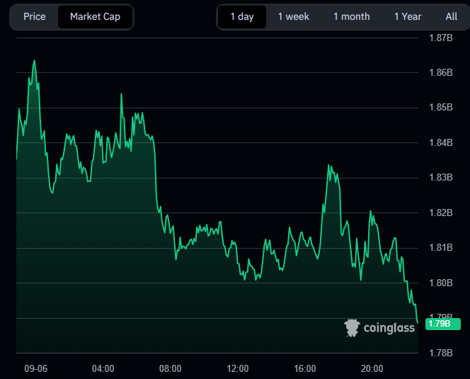 - Market cap coin fell from $1.87B to $1.79B, closing near daily lows as selling pressure dominated.