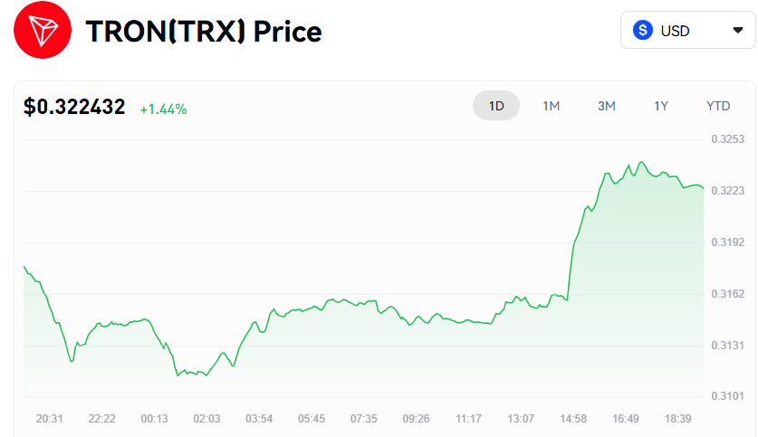 TRON TRX was improving at 1.44 percent every day, with the currency being traded at $0.322 USD following steady gains throughout the midday hours. The price increased by 0.311-0.323, and it is continuing rising with the minimum volatility. The trend was an indication of perpetuated belief in the power and utilisation of TRON networks.