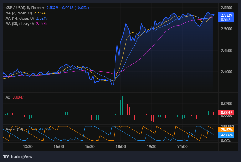 The XRP of Ripple recorded a sharp breakout in the direction of an increase against the USDT on the Phemex exchange, indicating the renewal of short-term momentum in the mid-cap altcoins. Between 17:30:00 and 18:00, the token rose by a value of 2.40 to 2.53 USDT, demonstrating a strong purchasing power. The acquisition was an indication of increased activity in the market following some consolidation.