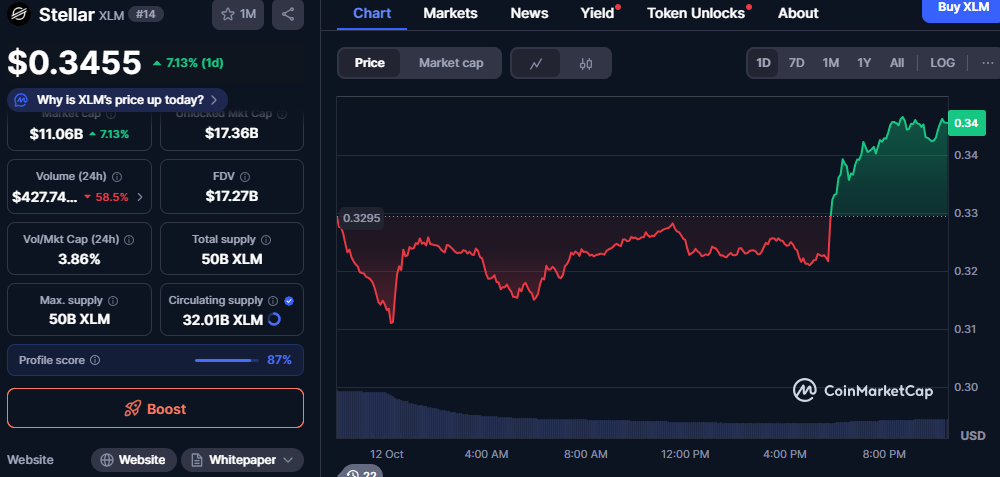 The chart of the token showed that there was a significant turnaround in late trading hours. XLM fell to approximately $0.3295 in the, earlier part of the session but shot up after 4 PM. The sharp ascending curve was a sign of the late-day bullish movements, which could be contributed by the renewed trust in its blockchain ecosystem.