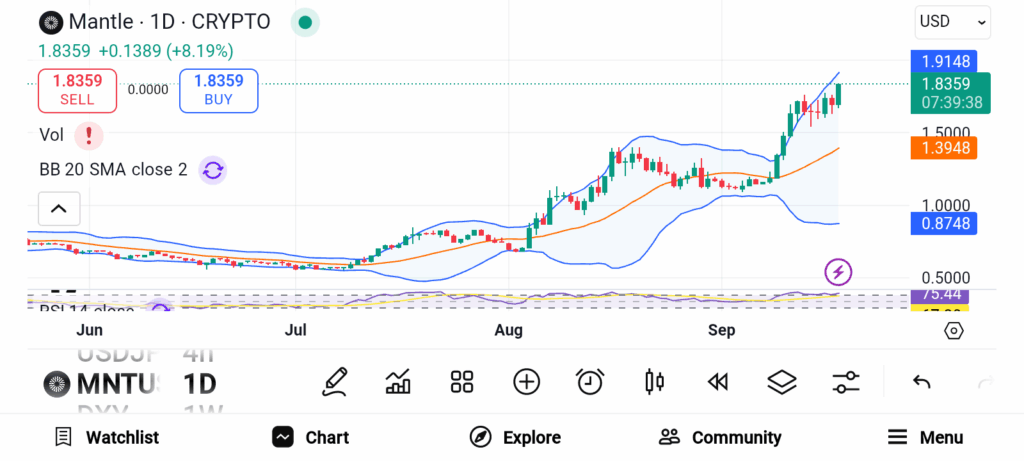 Mantle’s MNT has shown remarkable strength over the past week. The price climbed to about $1.69 after gaining 38 percent in seven days. Momentum began in early September when MNT moved from $1.30 and pushed toward $1.70. Trading volume surged more than 24 percent, revealing fresh interest from market participants. Around 74 percent of community sentiment remains bullish, underscoring confidence in further gains.