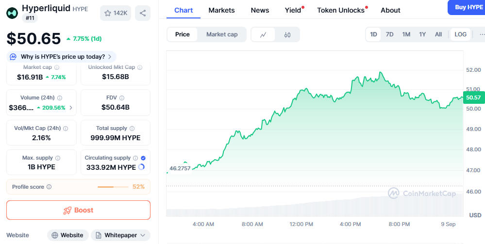 Hyperliquid traded at $50.65 after gaining 7.75 percent in a single day. The market cap reached $16.91 billion with trading volume at $366 million, surging by over 209 percent. The token’s sharp liquidity inflows pushed prices decisively above the $50 psychological threshold.