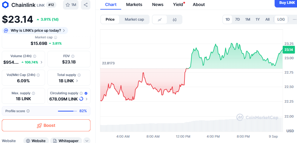 The token’s fully diluted valuation was $23.1 billion, consistent with its capped supply of 1 billion LINK. Circulating supply reached 678.09 million LINK, reflecting strong availability in the market. Liquidity remained firm with a volume-to-market cap ratio above six percent, supporting active intraday participation.