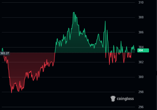 Aave started the day at $303.27 but slipped to an intraday low below $298 before recovering sharply. The token climbed past $308 in the morning session but failed to sustain the breakout. By the end of the day, it stabilized near $304.