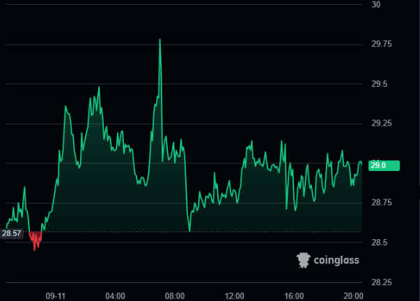 Avalanche opened trading at $28.57 and surged with multiple intraday peaks, reaching nearly $29.75 in the morning session. Following the rally, the price corrected with notable dips before stabilizing near $29.00. This showed a net daily gain supported by consistent upward momentum.