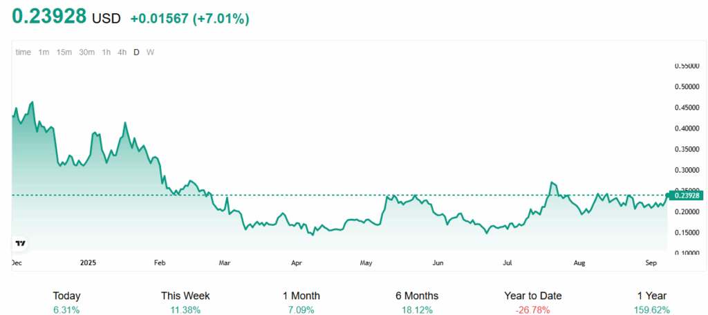 Dogecoin recorded steady gains over the past 24 hours, rising between six and eight percent across leading exchanges. Weekly performance also showed strength, with DOGE advancing between 6.6 and 11.3 percent. The movement placed it above many digital assets that struggled to generate comparable momentum.