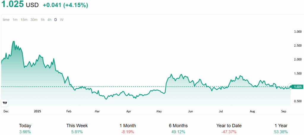 Pepe traded at $1.025 after gaining 4.15 percent in a single session. Weekly growth reached 5.81 percent, reflecting renewed short-term demand. However, the token declined 8.19 percent over the past month, indicating uneven momentum.