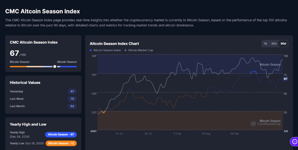 As the BTC dominance brings an ascending broadening wedge in the market, the CMC Altcoin Season Index is holding at 67 out of 100, placing conditions firmly within Altcoin Season. This reading evaluates the performance of the top 100 altcoins compared with Bitcoin over the last 90 days. Recent data shows yesterday’s index closed at 67, identical to the current level.