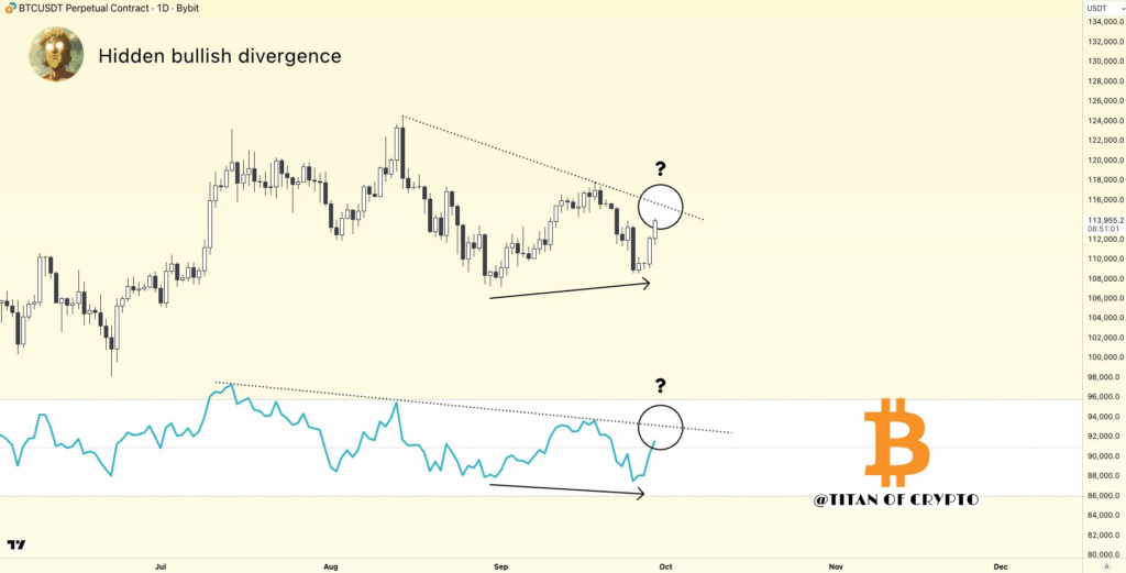 Alongside price activity, the Relative Strength Index (RSI) reveals a different trajectory. While Bitcoin recorded lower lows in September, RSI instead created higher lows. This setup forms what is identified as a hidden bullish divergence. Currently, RSI is rising toward its own downward-sloping resistance line, mirroring the price pattern above. The chart highlights both price and RSI resistance zones as potential areas for the next test.