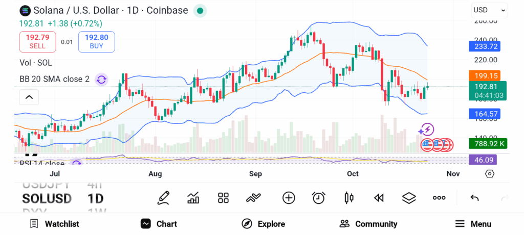 Momentum could build further if U.S. regulators approve Solana ETFs. Such products might attract institutional capital similar to Bitcoin and Ethereum ETFs, pushing prices higher. After bottoming near $100 in April, SOL trades around $184, sitting in a healthy accumulation range. With an RSI reading of 40, analysts consider this a favorable level for new entries.
