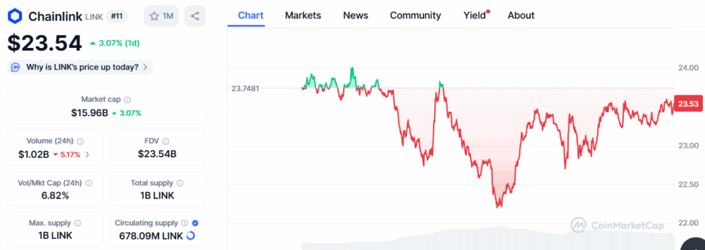 - Market capitalization stands at $15.96B with 678.09M LINK in circulation out of 1B maximum supply.