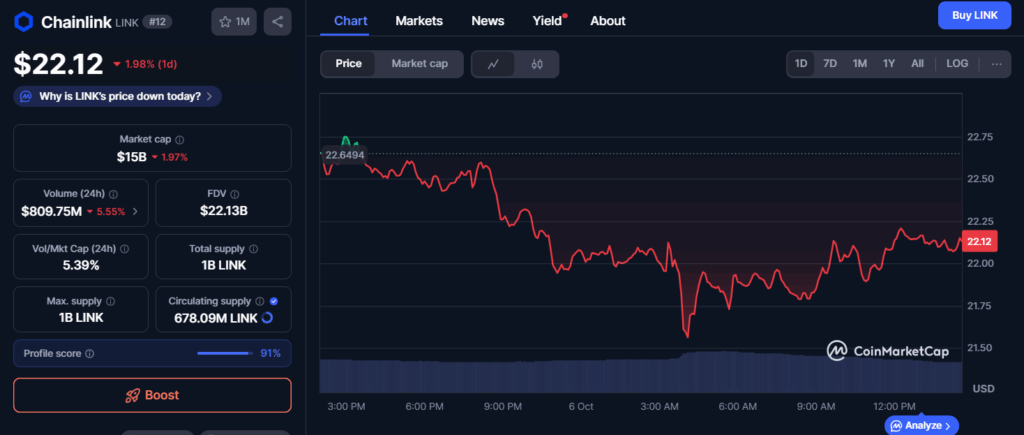 At the time of writing this article, Chainlink (LINK) traded at $22.12, recording a 1.98% decline over the past 24 hours. The price chart shows downward movement beginning near $22.65 before dropping below $22.25 during the late trading hours. The decline deepened around 3:00 a.m., when LINK briefly touched the $21.50 mark, marking the lowest point of the day.