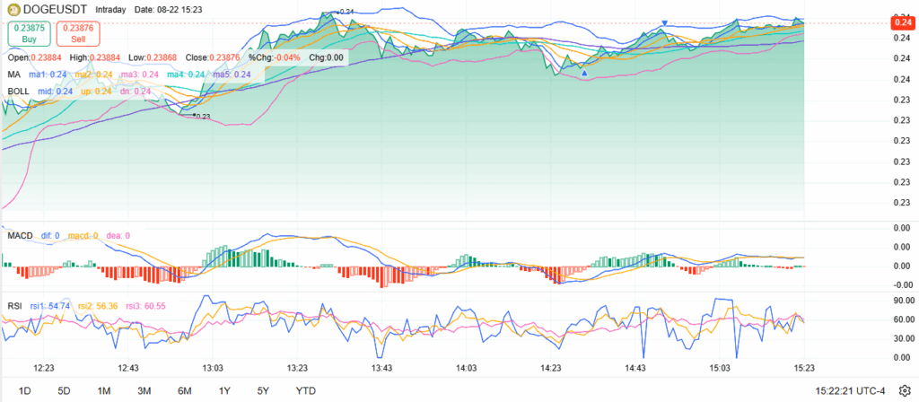 Dogecoin is trading at $0.238 and does not show active movement. Buyers and sellers are balanced in their positions. The moving averages cluster around the same level, indicating indecision and consolidation. The technical outlook, however, suggests that a breakout might be achieved upon a change in market conditions.
