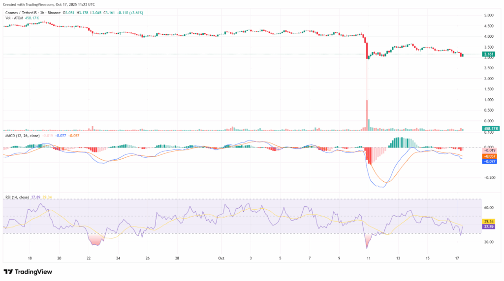 Cosmos (ATOM) experienced a steep selloff from $4.20 down to nearly $2.00. This move was followed by a stabilization phase around the $3.15 level. The rapid recovery formed a long lower wick, due to short-term bottoming.
