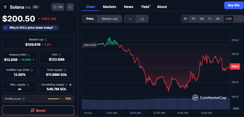 Solana’s price dropped 3.92% in the past 24 hours to $200.50, following an earlier high near $208.43. Despite the decline, the 24-hour trading volume increased by 16.56%, suggesting active market participation even amid selling. With a market cap of $109.61B, Solana still maintains strong dominance among Layer-1 networks.