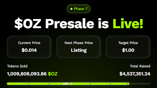 Now in its 7th OZ presale stage, Ozak AI has already raised over $4.5 million and sold more than 1 billion OZ tokens, showcasing immense early traction. The project’s partnerships with Perceptron Network, HIVE, and SINT strengthen its infrastructure: