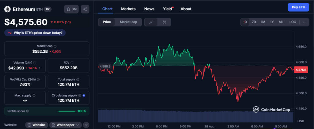 Tracking the ongoing price trend at the time of press, CoinMarketCap data reveals that Ethereum traded at $4,575.60, recording a slight daily decline of 0.03%. The price opened near $4,588 before moving downward through midday.