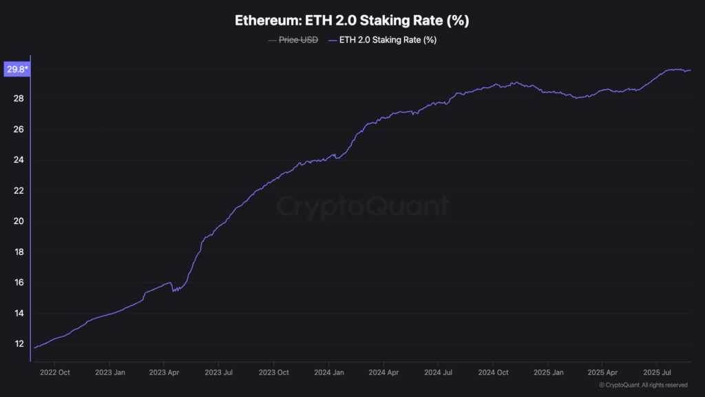 Ethereum’s ETH 2.0 staking rate has increased steadily since late 2022, reaching 29.8% by July 2025. In October 2022, the rate was near 12%. It rose to 14% in January 2023 and 16% in April. Growth accelerated between April and July 2023, pushing the rate above 20%. By October 2023, staking participation reached 22%.