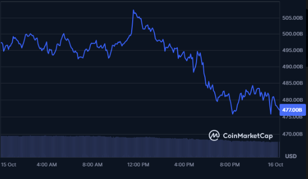 Ethereum is currently trading at $3,954.08, down 3.62% over the last 24 hours, with a market cap of $477.25 billion. The chart shows ETH struggling to maintain upward traction after peaking above $500 billion in market value earlier in the session. Trading volume fell by 27.46%, indicating reduced activity as market participants turned defensive.