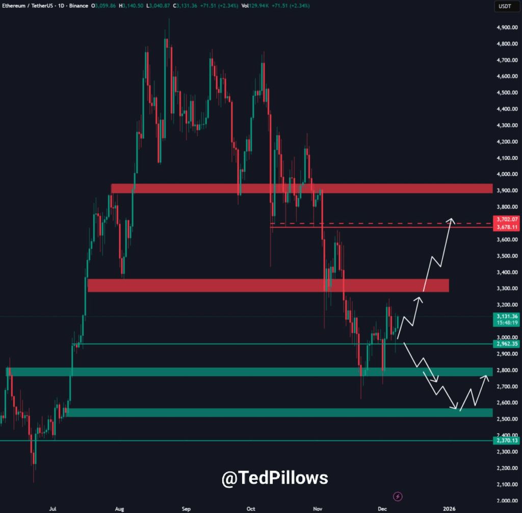 Other than a weekly bullish move, Ethereum hints at a potential continued uptick movement. According to an analysis by Ted, ETH has been trading within key support and resistance zones. The price has held above the $3,000 level, signaling a potential uptrend. Several whales have opened long positions in Ethereum, contributing to the price increase. Currently, Ethereum is testing the $3,300 to $3,400 resistance zone.