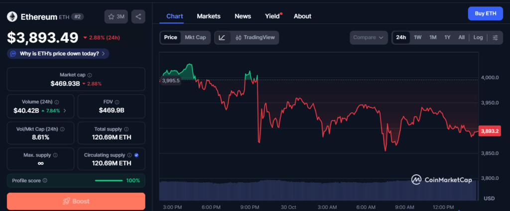Tracking the ongoing price trend at the time of writing this piece, CoinMarketCap data reveals that ETH is trading at a price value of $3,893.49, recording a 2.88% decline in the last 24 hours. The chart displayed a downward trend, with prices initially near $3,995.5 before a steady fall. Minor recoveries appeared mid-period, but each rebound met further downward pressure.