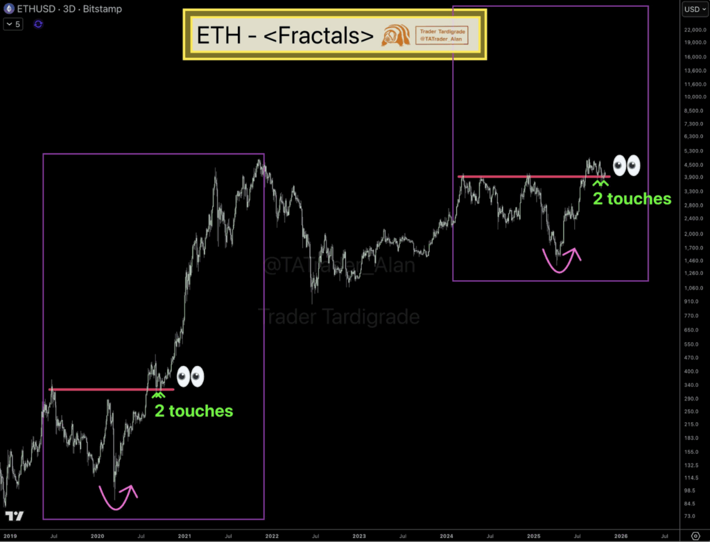 - Analysts note recurring consolidation and resistance touches that previously preceded Ethereum’s major rally.