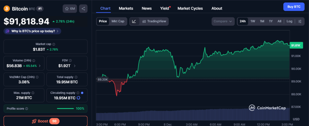 The Bitcoin price rose from $89,200 to $91,818.94, marking a 2.78% gain. The market cap reached $1.83 trillion, up 2.78%. The 24-hour trading volume surged to $56.83 billion, reflecting a 65.54% increase. The chart displays upward momentum, with a gradual climb throughout the day, peaking at over $91,800. There was a slight dip earlier in the day, but the price recovered quickly. Overall, the trend shows a strong positive movement, with Bitcoin showing notable gains in both price and trading activity.