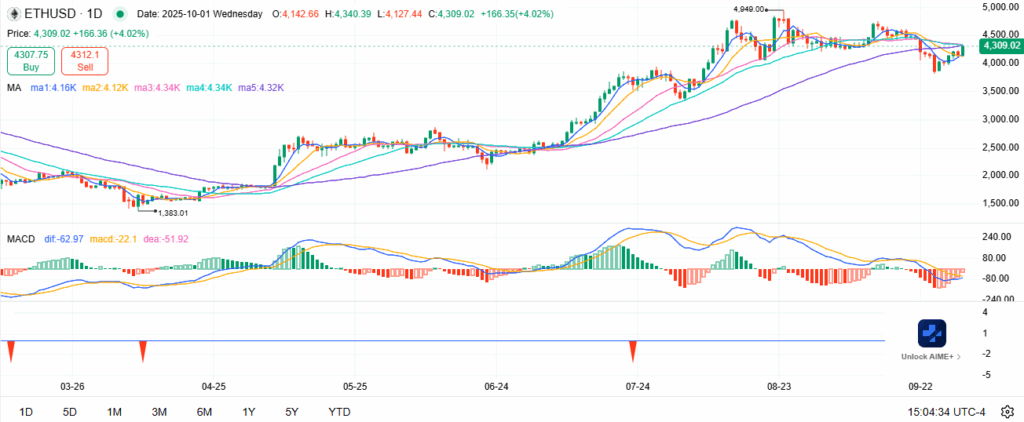 Ethereum trades at $4,309, recording a gain of 4.02% as it rebounds from the $4,000 support zone. The token corrected from highs near $4,949 but continues to consolidate within a strong bullish framework. This phase signals renewed stability and prepares ground for potential extension.