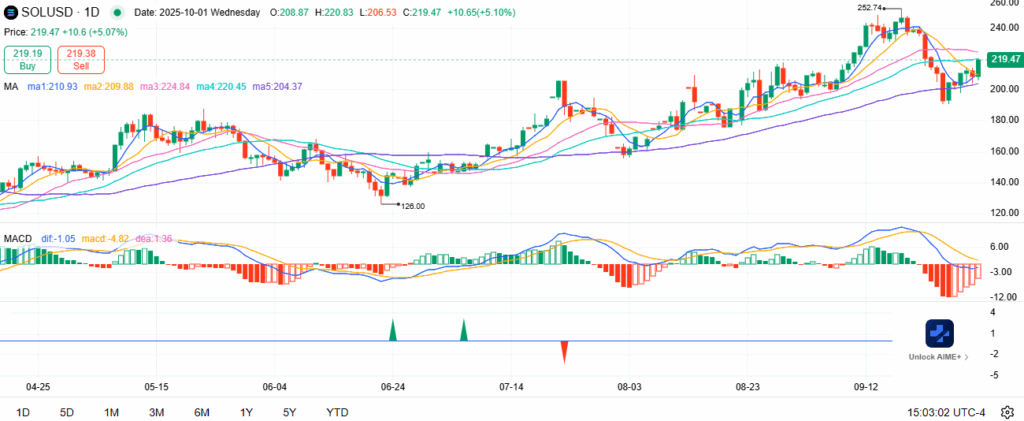 The MACD remains negative but shows recovery as bearish pressure eases. If Solana sustains above $220, a retest of $240–250 could follow. This performance reflects resilience and a clear attempt to regain higher ground.