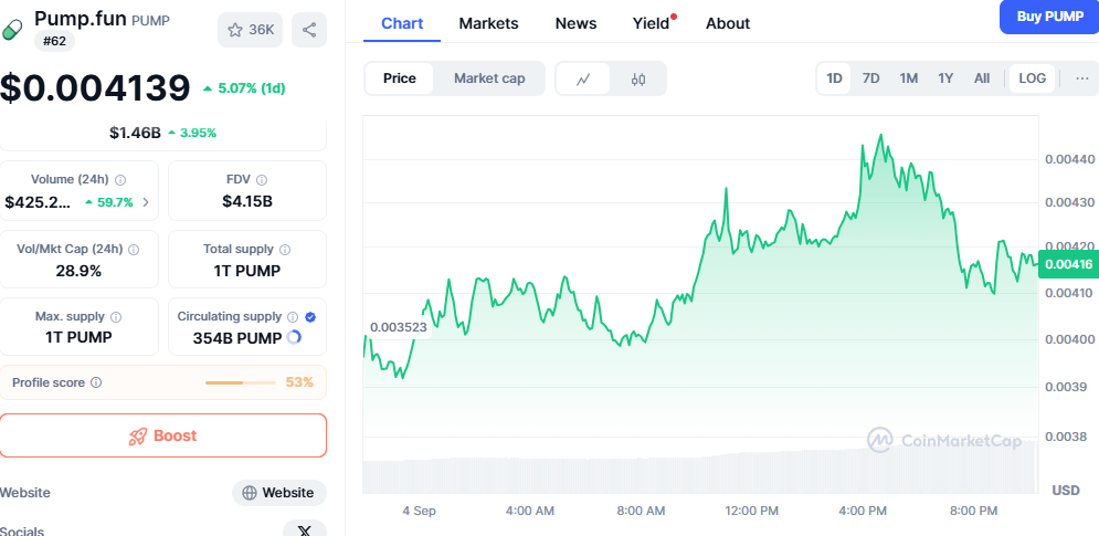 Pump.fun traded at $0.004139, posting a 5.07% gain supported by strong activity in microcap-style tokens. Its market capitalization reached $1.46 billion, while the fully diluted valuation stood at $4.15 billion. The surge highlighted increasing speculative engagement.