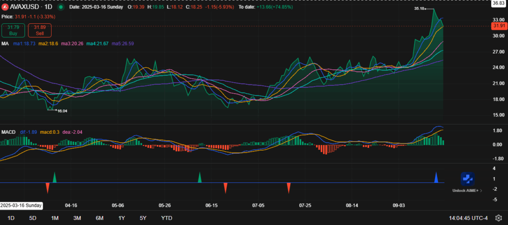 Avalanche rallied strongly in recent months, soaring from $18 to a peak of $35 before retracing to $31. The asset remains up over 70% year-to-date despite the latest correction. The recent pullback indicated cooling demand as profit-taking increased.