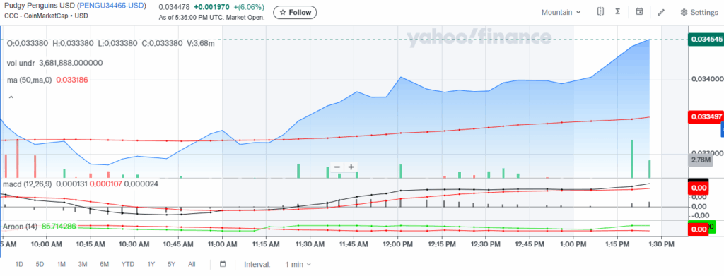 PENGU displayed a methodical grind higher and printed consistently higher lows. Price stayed firmly above the 50-period moving average around 0.03319. Social feeds reflected energized community activity, and trending tags amplified visibility.