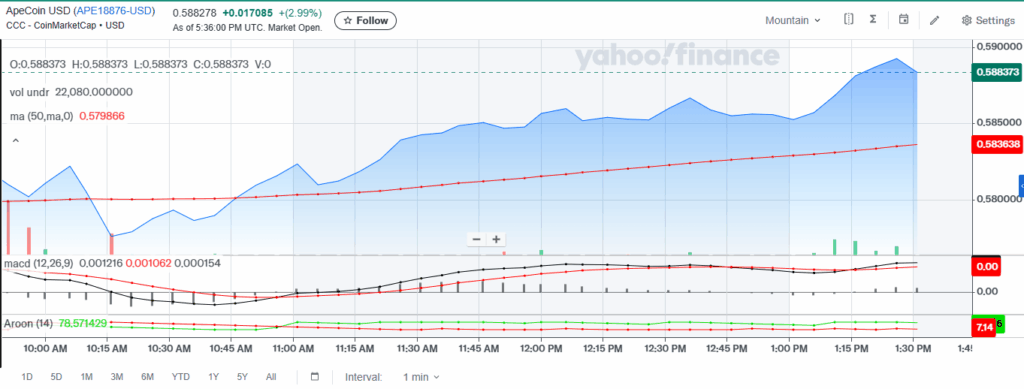 APE climbed most of the day and traded above its 50-period moving average near 0.5799. Sentiment posts and ecosystem chatter improved, and participation tilted greener into higher prices. The intraday trend favored shallow pullbacks and measured extensions.