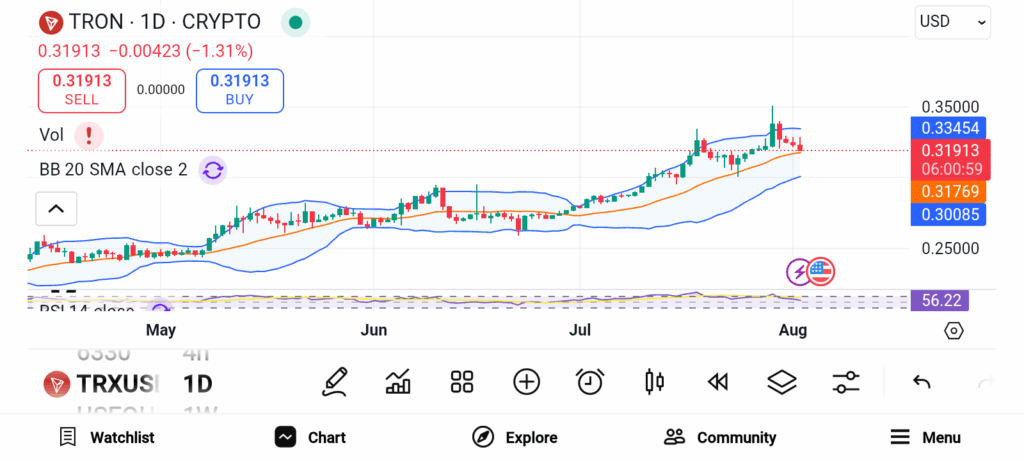 Tron Blockchain is gaining traction in both crypto and traditional finance spaces. The company behind Tron recently went public on Nasdaq, putting the project in front of new audiences. A $1 billion plan for financial tools is also underway, designed to merge blockchain with legacy systems. Tron Inc. currently holds over 365 million TRX tokens, backing its own platform with real value. TRX now trades at $0.3236 and has gained 2.9% over the past week. That rise has helped Tron slightly edge past Cardano in total market cap. The platform continues to grow, and its leadership seems focused on integrating crypto with mainstream finance.