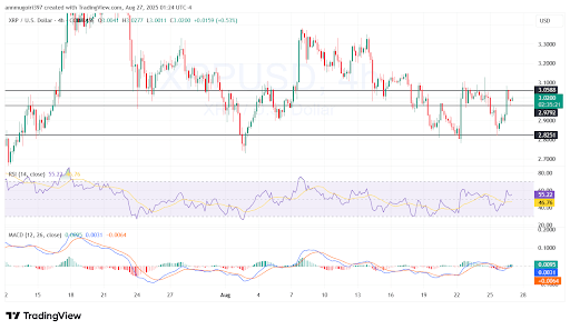 According to a TradingView technical analysis, XRP exchanges at $3.02 after recovering from a recent dip near $2.97. The price indicates a consolidation between $2.82 and $3.10, with rejections at both support and resistance. Current levels indicate a neutral market as the crypto tries to sustain and trade above the $3.00 zone.