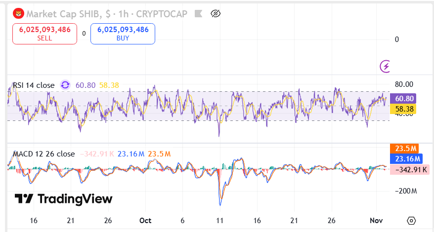 Current data shows that Shiba Inu’s market capitalization sits near $6.03 billion, evenly split between buy and sell orders. The symmetrical nature of these figures reinforces a balanced market structure, with neither side exerting dominant pressure.
