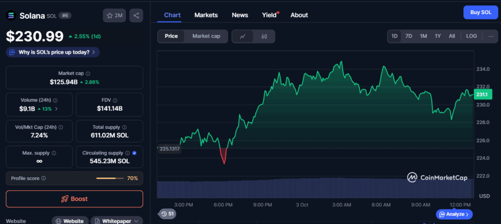 Tracking the ongoing price trend at the time of press, a CoinMarketCap report on the daily performance reveals that Solana traded at $230.99 with a daily gain of 2.55% in the latest session. Its market capitalization reached $125.94 billion, advancing 2.86% during the same period. Trading volume stood at $9.1 billion within 24 hours, marking a 13% rise.