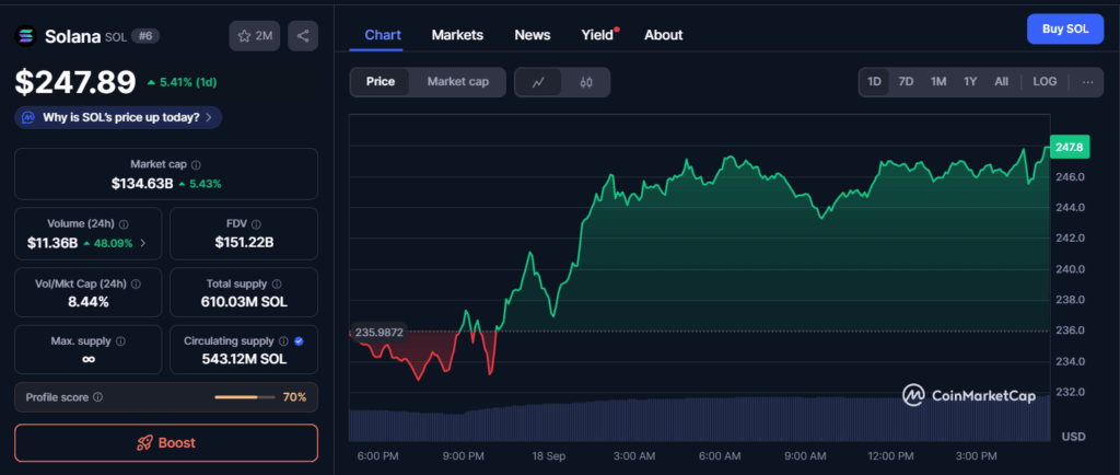 Tracking the ongoing price trend at the time of press, data from CoinMarketCap reveals that Solana (SOL) traded at $247.89, recording a 5.41% daily gain. The session opened with a dip to $235.98, marking the intraday low. After this decline, the token reversed course and entered a strong upward move, climbing past $240 overnight.