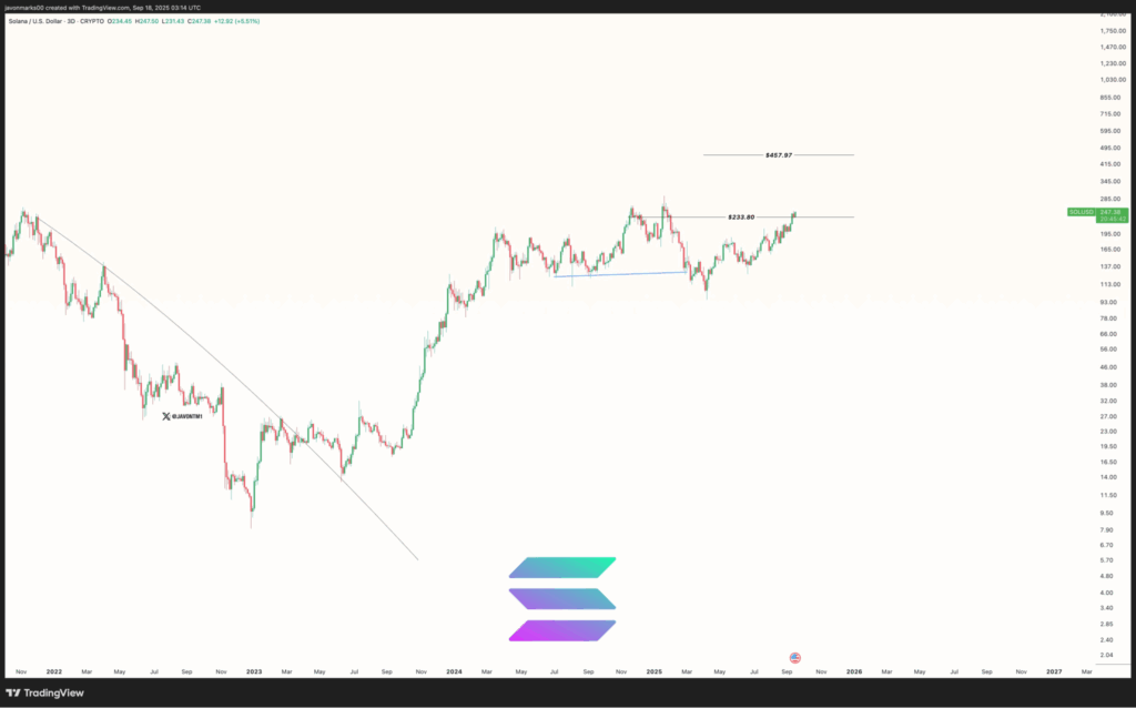 According to an observation prepared by Javon Marks, Solana (SOL) has regained a critical level following a steady recovery from the extended decline seen in 2022. The chart reflects a clear transition, showing higher lows across 2023 and 2024, with price action now anchored at $233.80. This point has emerged as a structural marker in the ongoing trend, forming the basis for the next charted target of $457.97.