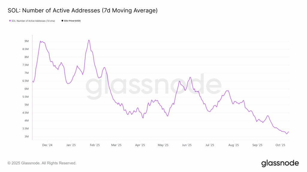 - Solana’s active addresses decline to 3.3 million, down from January’s peak of 9 million.