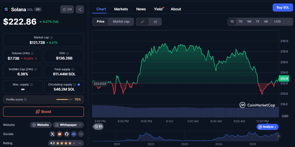 A look at the current price trend, CoinMarketCap data reveals that the Solana price chart shows the asset trading at $222.86, with a slight increase of 0.27% in the last 24 hours. Over the past day, the price fluctuated between a low of $222.01 and a high nearing $230.