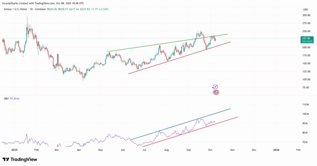 To further validate the bullish trend, another analysis by Ali Charts reveals that SOL displays a strong upward trajectory, breaking past resistance levels. The chart illustrates a cup-and-handle pattern, with a notable price rise from approximately $20 in mid-2022 to around $230 in October 2025.