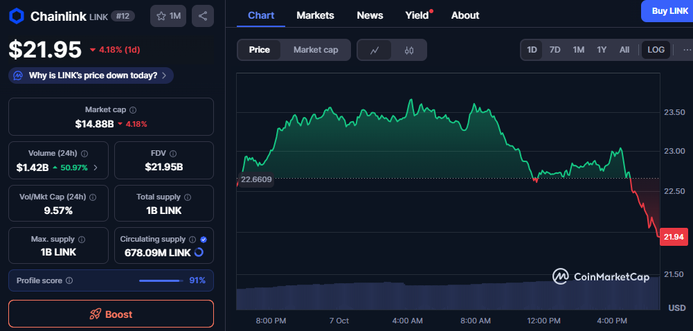 Chainlink (LINK) had a relatively moderate price adjustment in the last 24 hours, reducing by 4.18 percent to trade around the area of $21.95. The low came after a short hump which occurred earlier in the day when LINK briefly rose above 23.50 and then gave in. Nevertheless, LINK is still strong in the category of large altcoins as it is the 12th with a market capitalization of 14.88 billion.