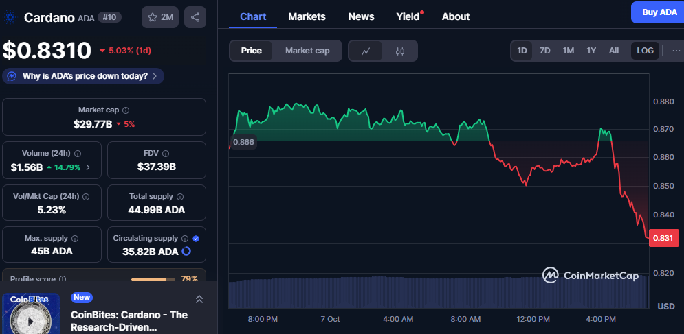 ADA recorded a 5.03% downward movement within the last 24 hours, leading to the present cost of the token at 0.8310 and an aggregate market value of 29.77 billion. The assets trading volume also increased up 14.79 to 1.56 billion, which is a strong participation despite the decreasing trend. The drop represents the temporary deficiency in the overall altcoin market because of profit-rebalancing and rebalancing.