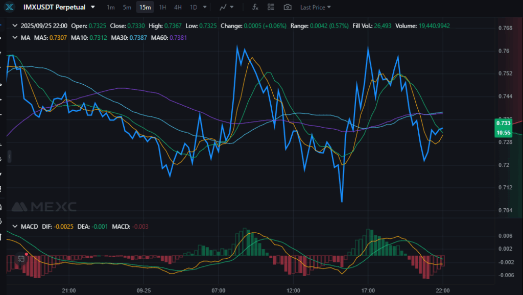 The moving averages for IMX suggest the market is stabilizing. The short-term moving averages (MA5 and MA10) show slight bullish crossovers, indicating potential upside. As the price hovers around these levels, the trend shows some signs of recovery, though not yet enough to establish a solid bullish trend.